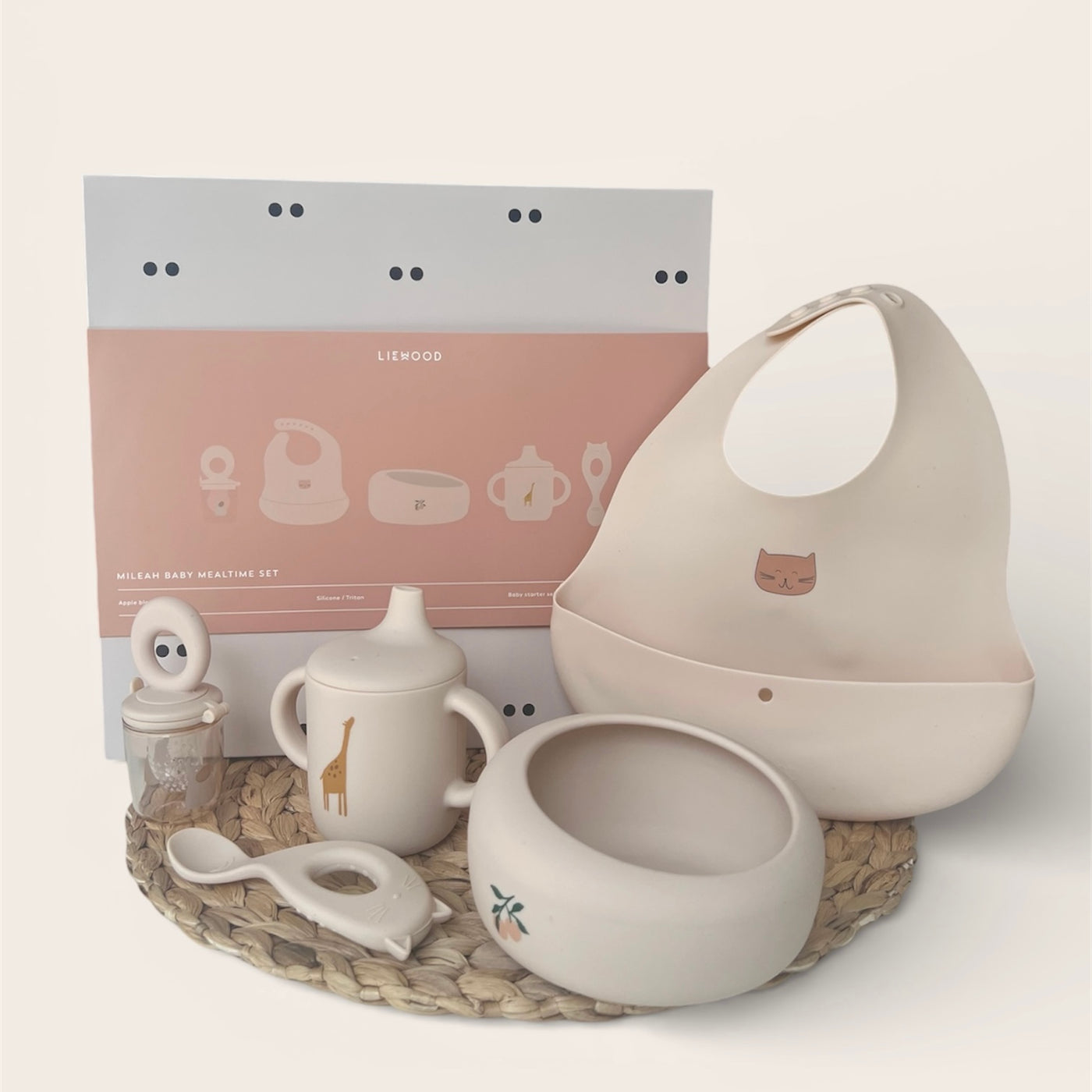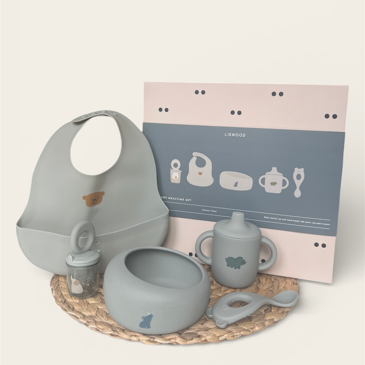 - Das Set enthält ein Lätzchen, einen Becher, eine Schale, einen Teller, einen Löffel und einen Fruchtschnuller